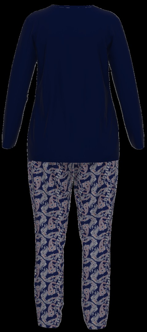 Bei diesem hochwertigen Damen Pyjama wurde das Obterteil mit V-Ausschnitt sowie langem Arm in blau multi-color und die Hose mit blau und im paisley Dessin gemustert designt