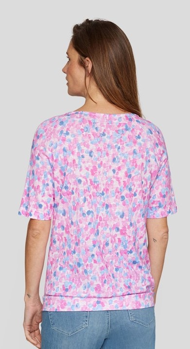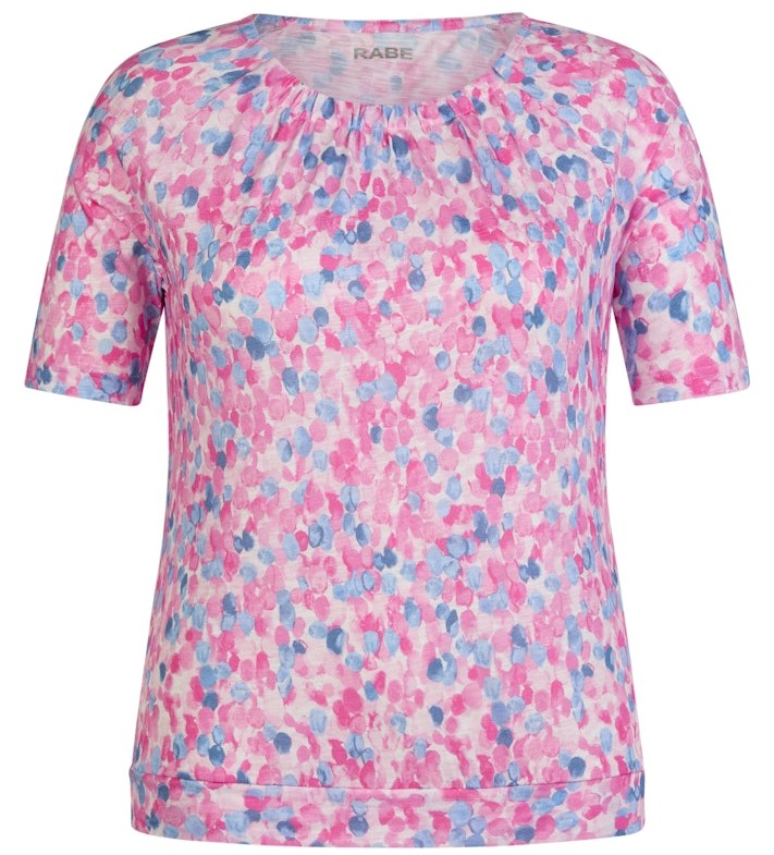 Das sportive Shirt wurde mit mehrfarbig mit rosa gemustert designt und lässt sich immer sehr leicht kombinieren. Der dezent geraffte runde Ausschnitt verleiht diesem Shirt mit 1/2 Arm eine besondere Note