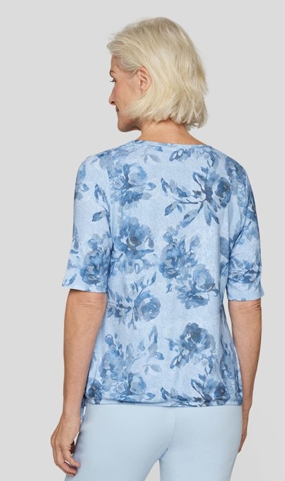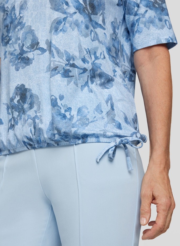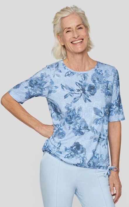 Das sportive Shirt wurde mit pastellblau floral gemustert designt und lässt sich immer prima kombinieren. Seitlich leicht raffbar macht dieses Shirt mit rundem Ausschnitt immer eine gute Figur