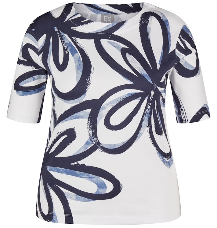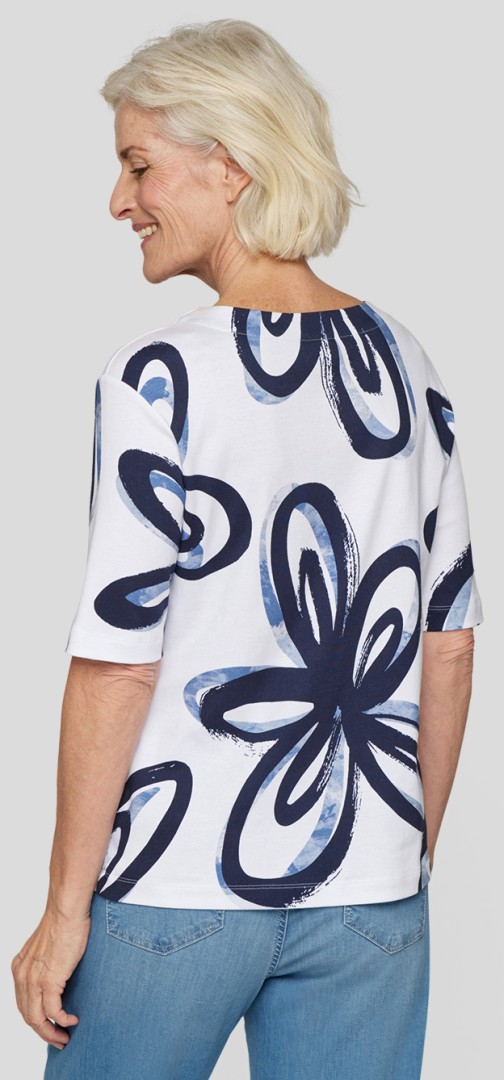 Das sportive Shirt in 100 % Baumwolle wurde in weiß mit sportivem Druck in marine blau versehen und ist immer ein Hingucker und leicht kombinierbar mit 1/2 Arm und rundem Ausschnitt