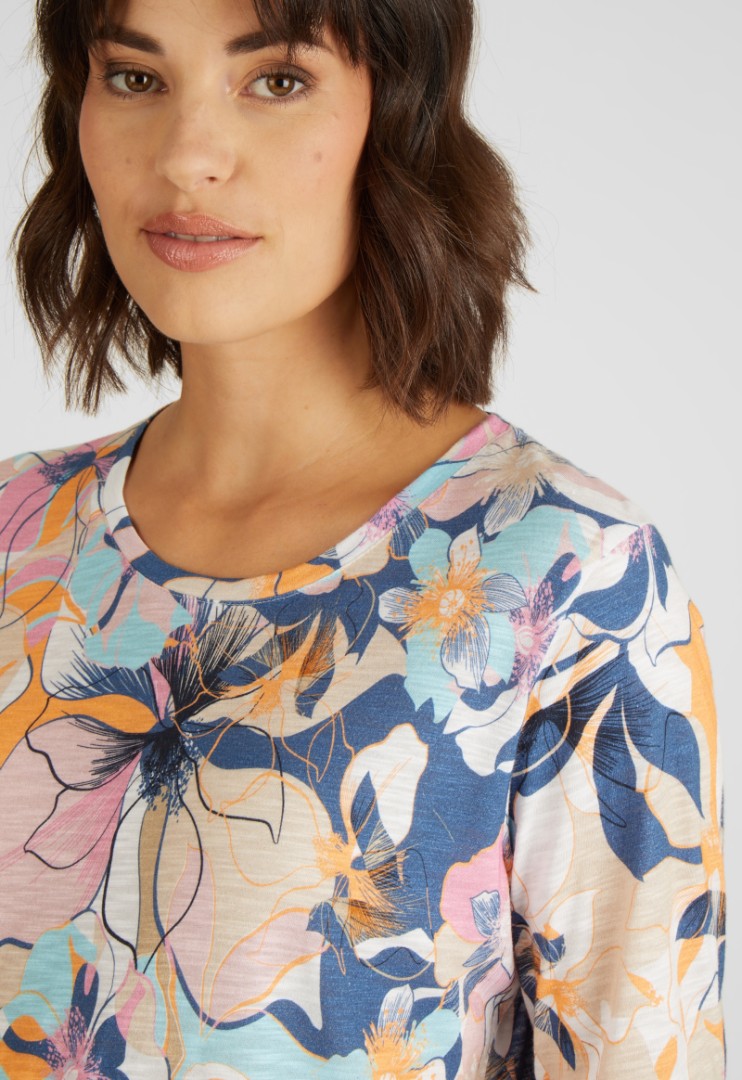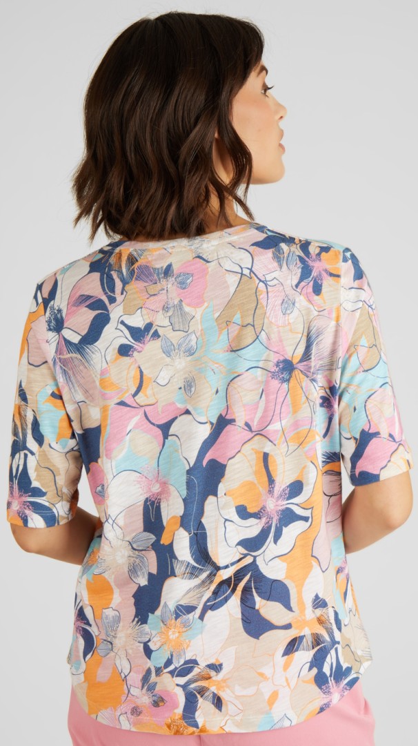 Dieses T-Shirt mit 1/2 Arm wurde mit rundem Ausschnitt in mehrfarbig gemustert designt und ist immer leicht zu kombinieren