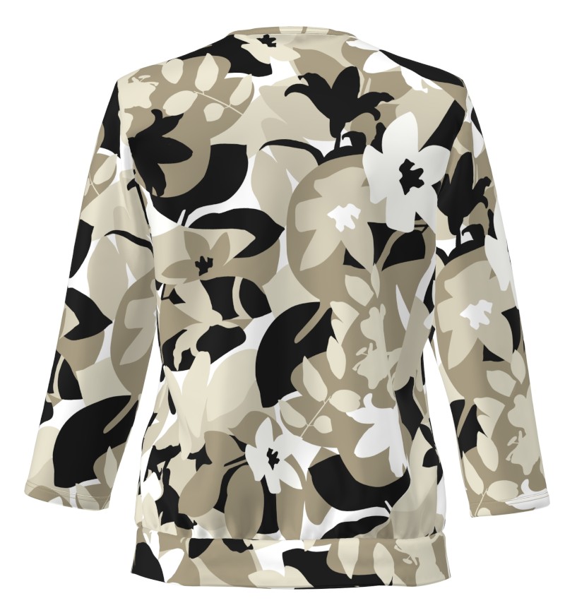 Dieses sportive Shirt mit 3/4 Arm wurde im Blütendesign mehrfarbig mit beige-braun designt. Die dezente Raffung unter dem runden Ausschnitt sowie das Bündchen im Abschluss verleiht diesem Shirt einen zusätzlichen Charme