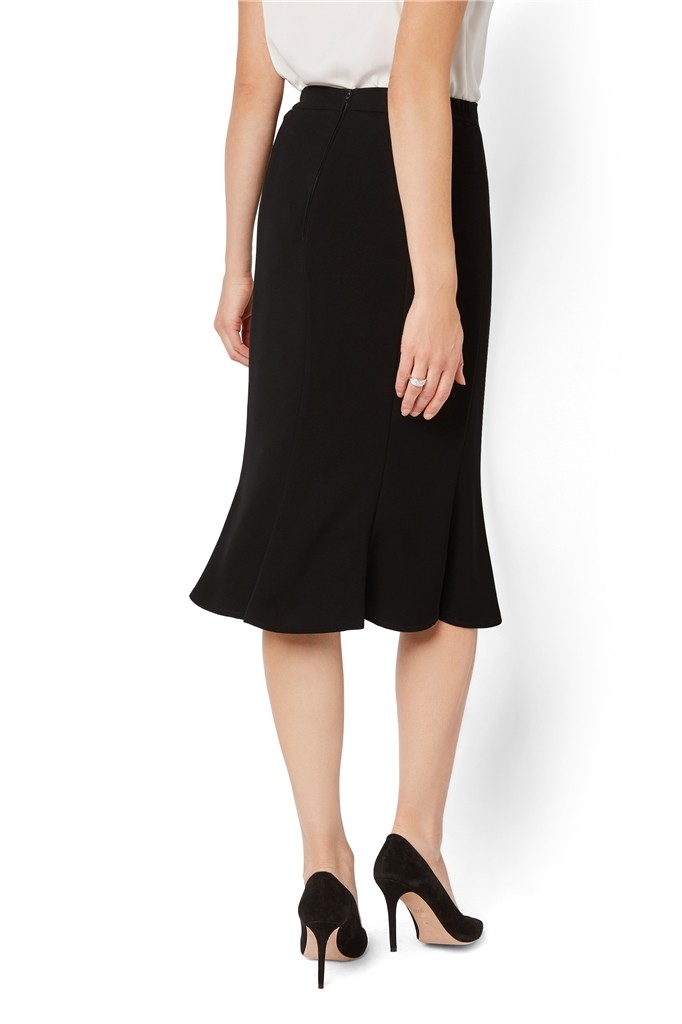 Dieser gefütterte schwarze Godetrock macht durch den seitlichen Gummizug immer ein gute Figur und ist natürlich knitterfrei. Durch die leicht schwingenden 8 Bahnen ist dieser etwas längere Rock ein echter Klassiker und überaus vielseitig kombinierbar