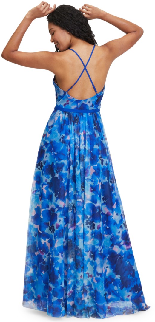 Dieses maxi lange Kleid ohne Arm wurde in blue light blue designt. Mit V-Ausschnitt sowie gepolsterten Cups und floralem Dessin wurde dieses Modell mit transparentem Tüll versehen. Auch der in Falten gelegte Rockteil verleit diesem Kleid einen ganz besonderen Charme