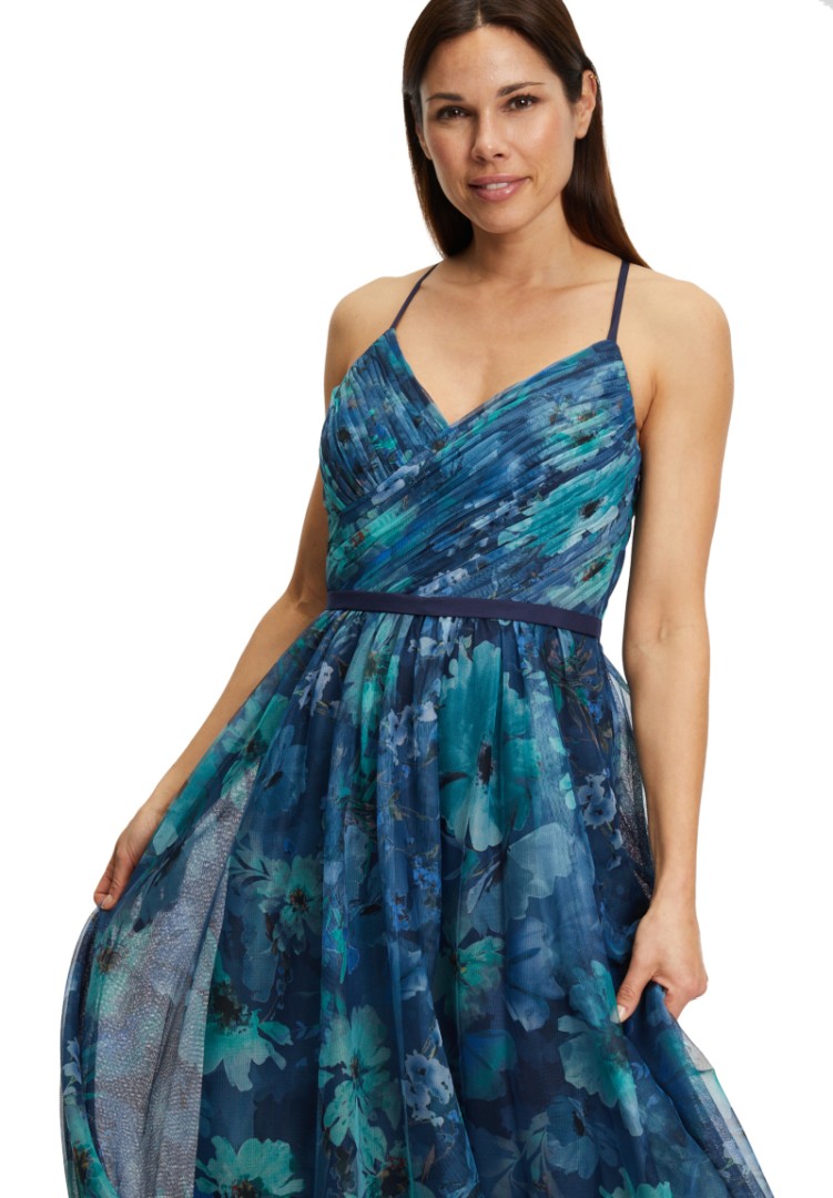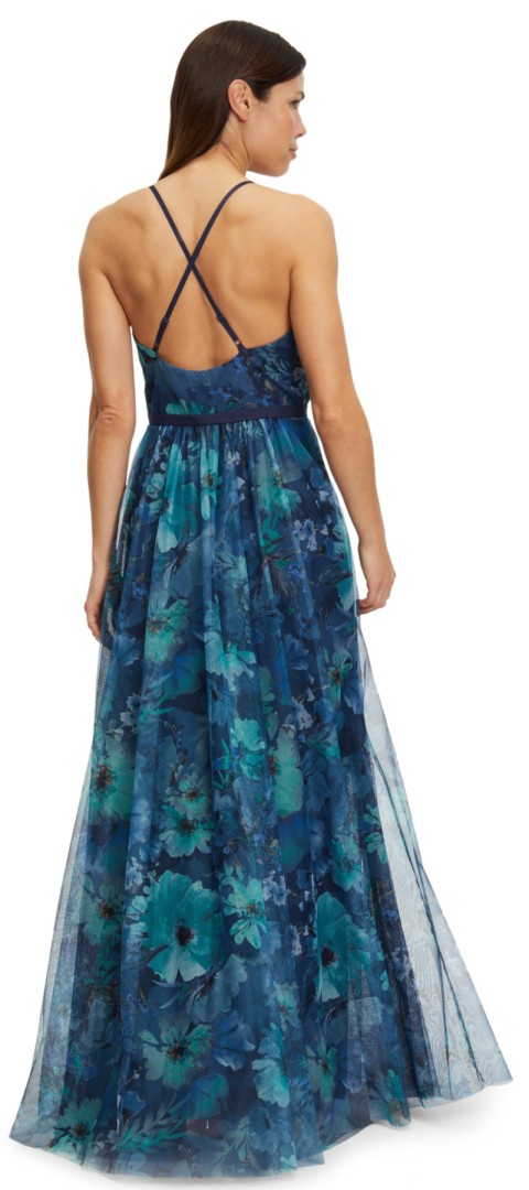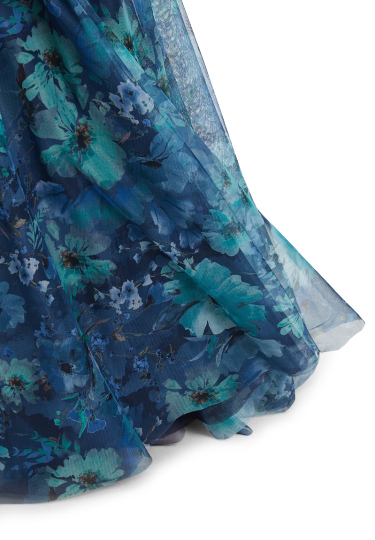 Dieses maxi lange Kleid ohne Arm wurde in dark blue mint designt. Mit V-Ausschnitt sowie gepolsterten Cups und floralem Dessin wurde dieses Modell mit transparentem Tüll versehen. Auch der in Falten gelegte Rockteil verleit diesem Kleid einen ganz besonderen Charme