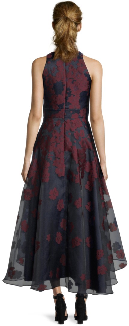 Dieses modische Vokuhila Ballkleid wurde in dark/blue - dark/red dezent floral im Jacquard Style designt. Ärmellos mit Amerikansichem Ausschnitt sowie den gepolsterten Cups ist dieses ausgestellte Modell ein echtes Highlight für die besonderen Anlässe