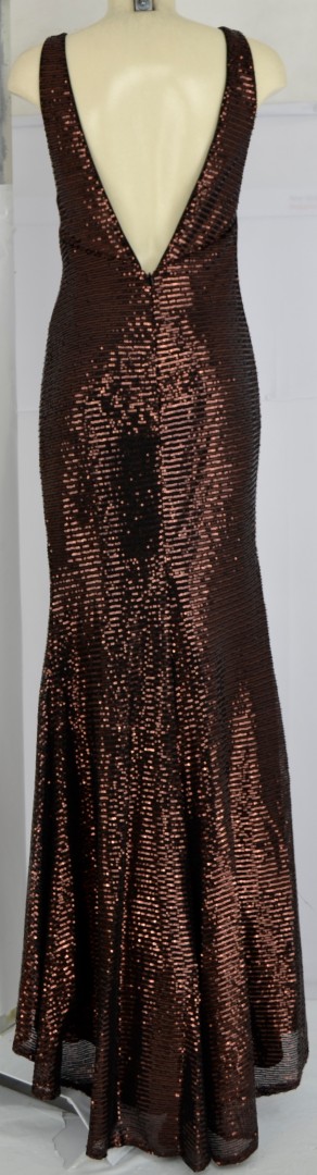 Das edle Kleid in black-brown wurde allover mit feinen Pailletten besetzt. In A-Form und mit dem ca. 80 cm Schlitzt (seitlich vorne) sowie V-Ausschnitt vorne und hinten ist dieses leicht glänzende Modell ein Highlight unter den neuen Ballkleidern. Der angedeutete Vokuhila Style vermittelt zudem einen zusätzlichen Charme
