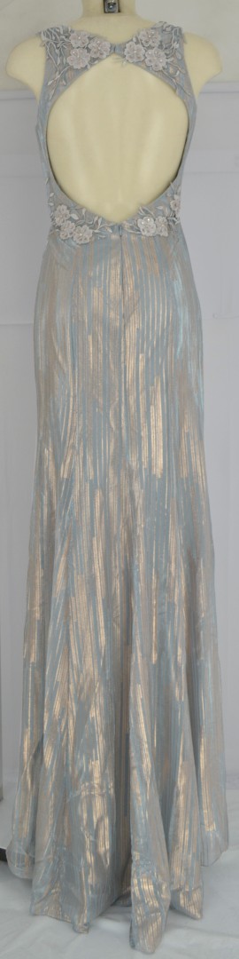 Dieses lange Abendkleid im Vokuhila Style gehört zu den Highlights der Saison. Mit viel Glanz in grey-mint sowie den Aplikationen aus feiner Spitze und der romantischen Rücken Optik werden Sie mit diesem Modell gewiss im Mittelpunkt stehen