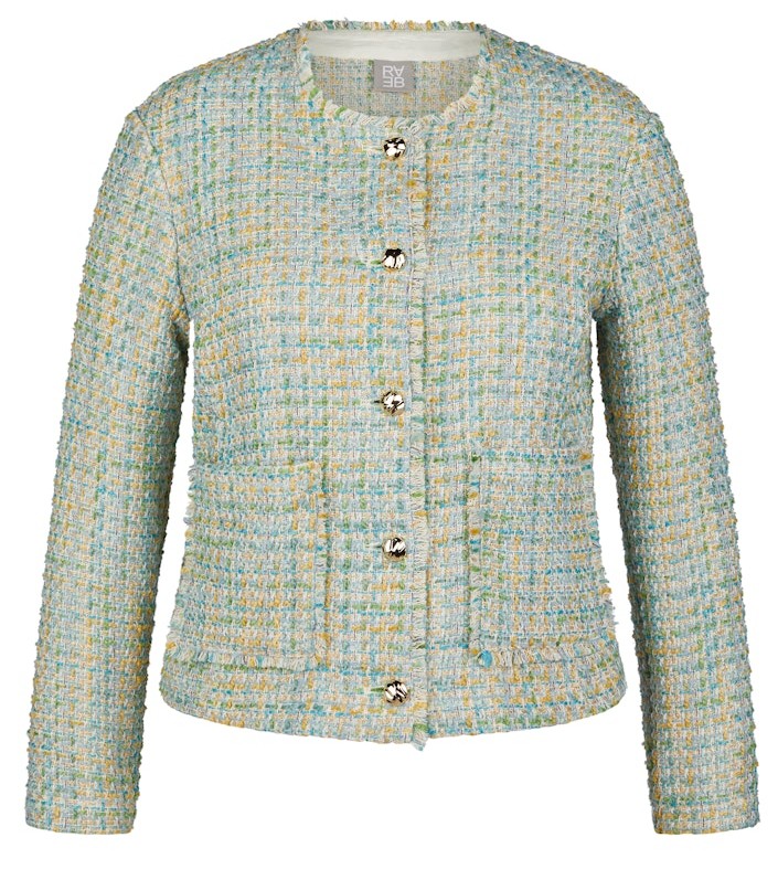 Diese sportive Jacke wurde in mehrfarbig mit smaragd gemuster in einer feinen Boucle Optik designt. Als 5-Knopf Variante mit den zwei aufgesetzten Taschen lässt sich diese Jacke auch zu Ihren besonderen Anlässen prima kombinieren