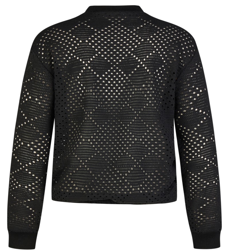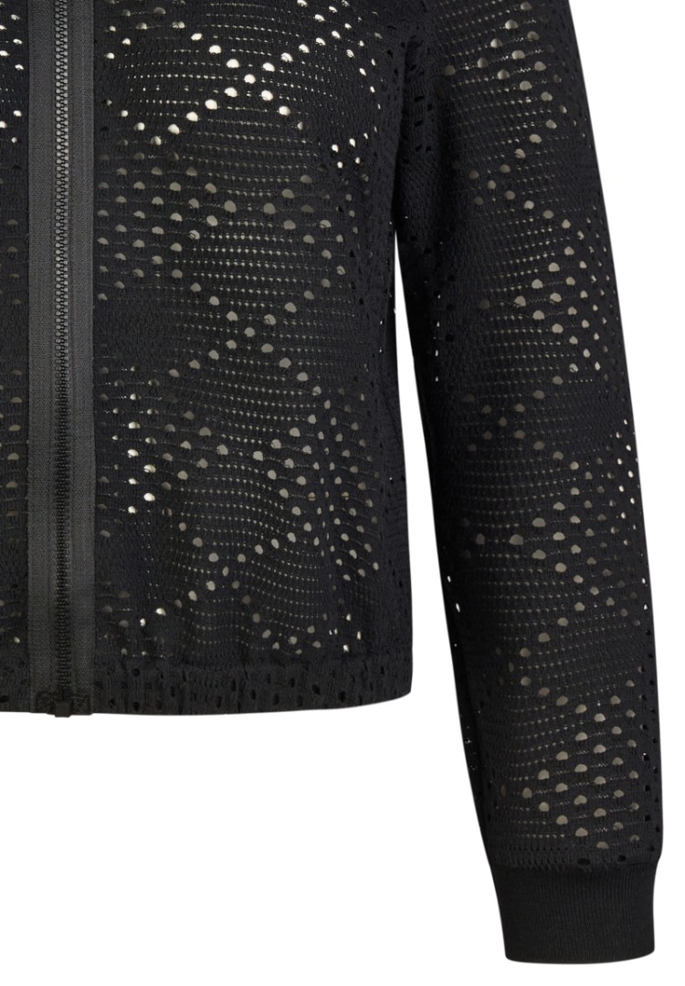 Diese modische sowie etwas verkürzte Blazer Jacke wurde mit R-V und Stehkragen in uni schwarz designt. Auch die dezente Loch-Optik verleiht dieser Jacke einen besonderen Charme