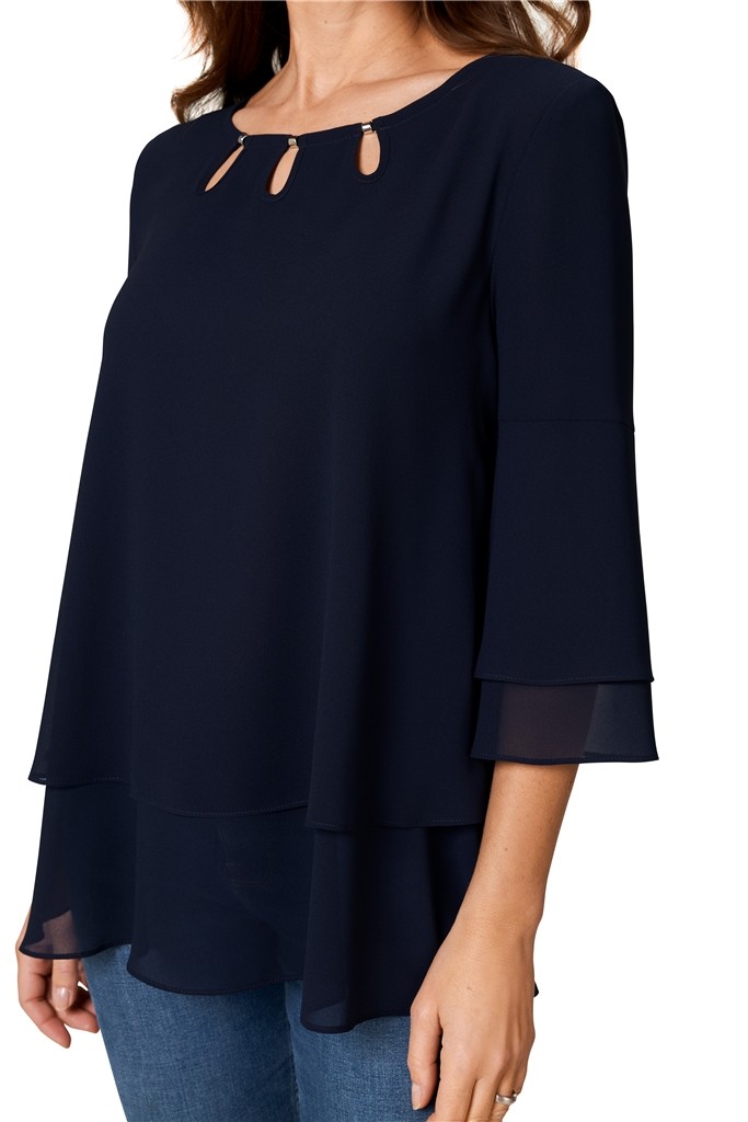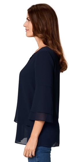 Dieses Blusenshirt wurde mit 3/4 langem Arm in marine-blau designt und kann auch zu den ganz besonderen Anlässen getragen werden. Die Lagen-Optik mit dem leicht transparentem Abschluss sowie der romantische Ausschnitt verleihen diessem Shirt einen besonderen Charme