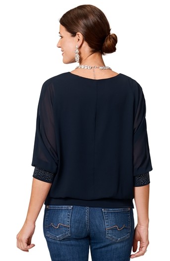Dieses Blusenshirt wurde mit 3/4 langem Arm in marine-blau designt und kann auch zu den ganz besonderen Anlässen getragen werden. Die Ärmel und der Abschluss wurde hier mit breitem sowie Strass versziertem Stretch-Bündchen versehen