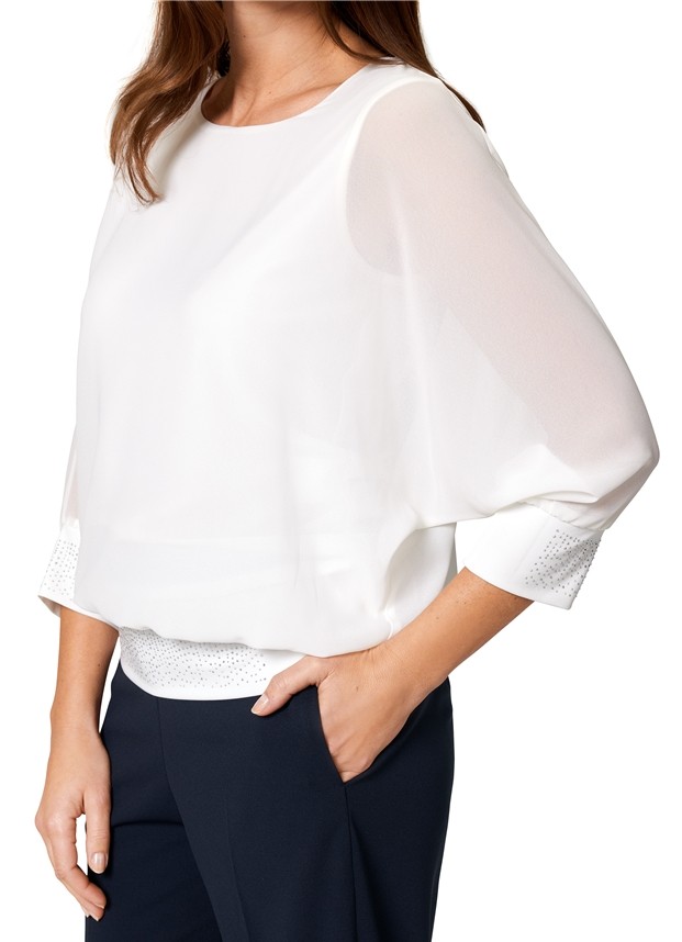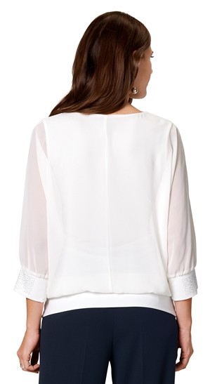 Dieses Blusenshirt wurde mit 3/4 langem Arm in marshmallow designt und kann auch zu den ganz besonderen Anlässen getragen werden. Die Ärmel und der Abschluss wurde hier mit breitem sowie Strass versziertem Stretch-Bündchen versehen