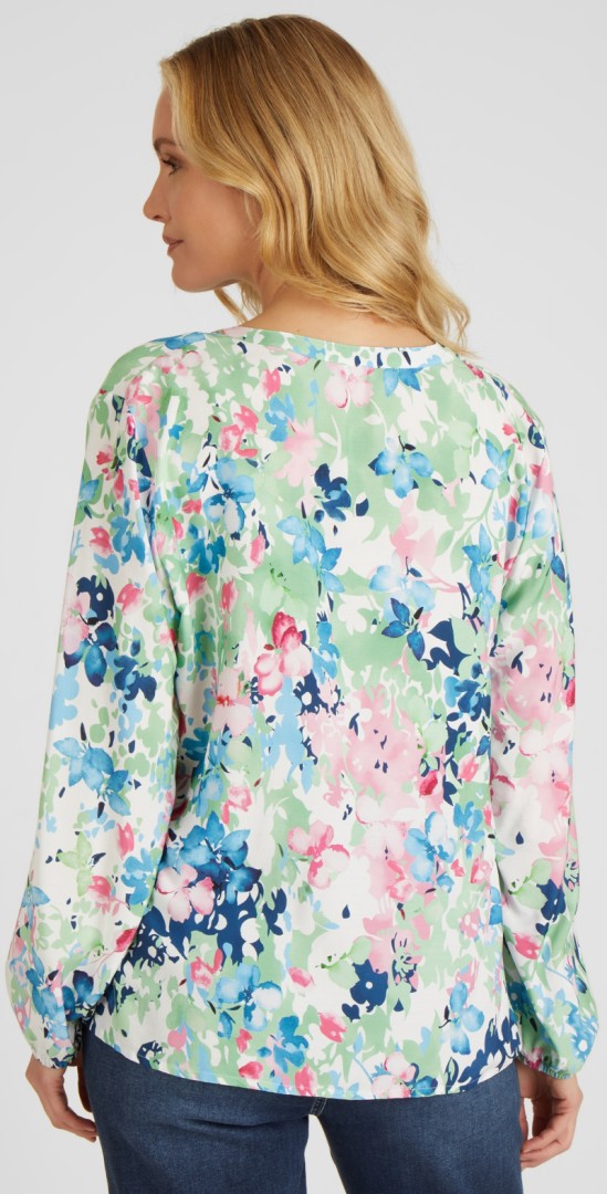 Dieses leicht fließende romantische Blusen - Shirt wurde in mehrfarbig allover mit feinen Blüten designt. Der Stehkragen mit dezenter Raffung unter dem runden Ausschnitt sowie der Rund-Um-Gummi Abschluss an den 1/1 langen Ärmeln machen das Shirt zum echten Hingucker