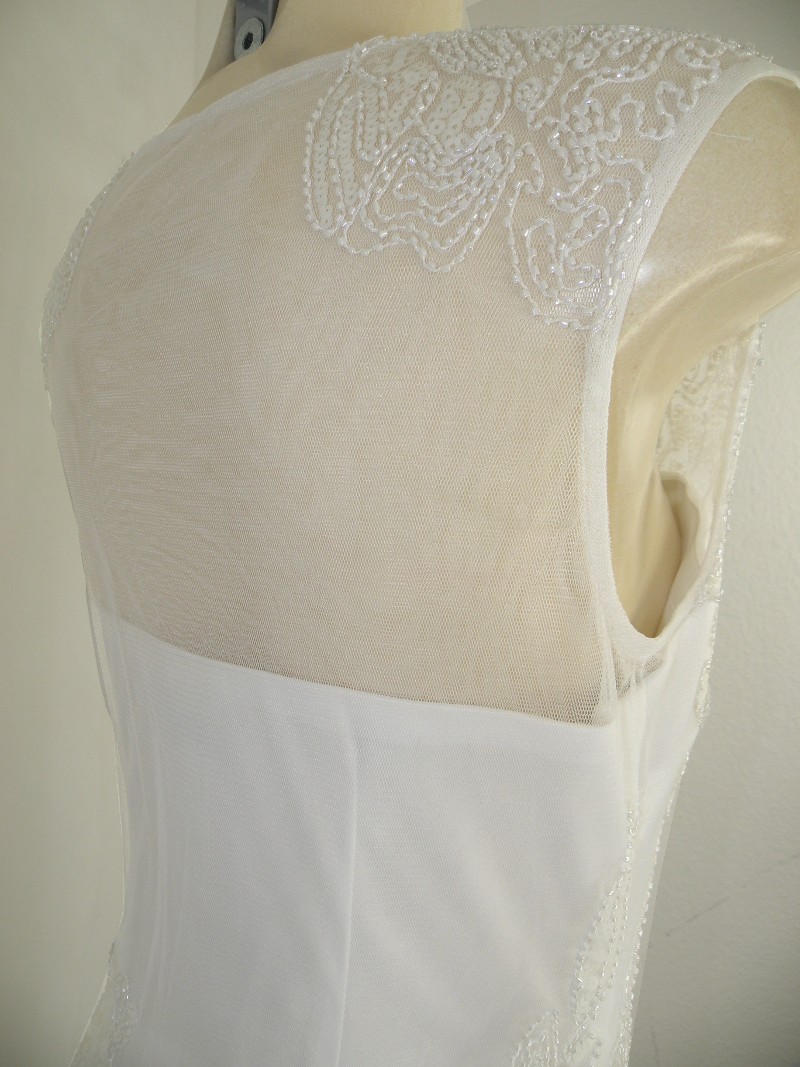 Ein romantisch schönes Kleid für den ganz besonderen Auftritt. Allover mit Pailletten versehen ist das Modell in Farbe cream white ein echter Traum mit einem transparentem hochgeschlossenem runden Ausschnitt