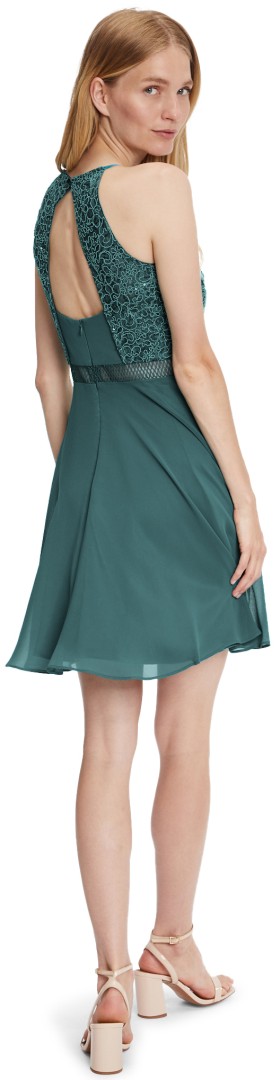 Dieses romantische Cocktailkleid wurde in dark emerald designt. Eine leicht transparente Taille sowie die dezente Fransen-Optik am Bustier machen dieses kurze Kleid zum echten Hingucker