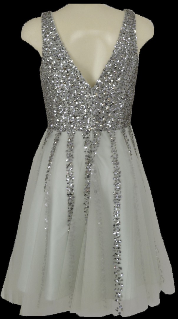 Das romantische Cocktailkleid wurde in misty jade designt bei dem das Butier mit edlem Schmuck und Pailletten versehen wurde. Auch der mit Schmuck besetzte und in Falten gelegte Rockteil aus Mesh macht dieses Modell zum echten Hingucker