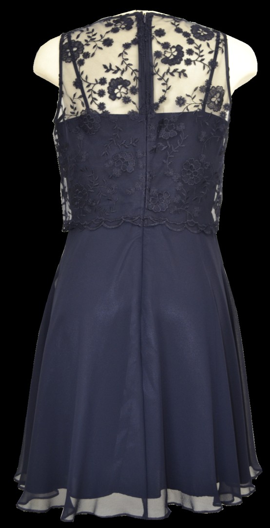 Dieses Kleid ist wie geschaffen für den besonderen Anlass. Das leicht transparente Oberteil im feinen Spitzen Jacquard Dessin mit rundem Ausschnitt über dem dunkel blauen Kleid in A-Form vermittelt hier eine besondere romantische Eleganz