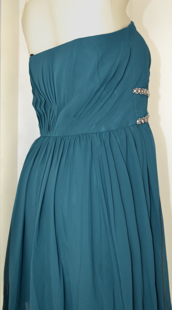 Einfach traumhaft ist dieses kurze Kleid in ocean teal. Die modisch geraffte Corsage mit den wattierten Cups und den Silikonstreifen für einen sicheren Halt sind neben dem edlen doppelten Schmuck Besatz in der Taille einfach nur romantisch schön anszuschauen