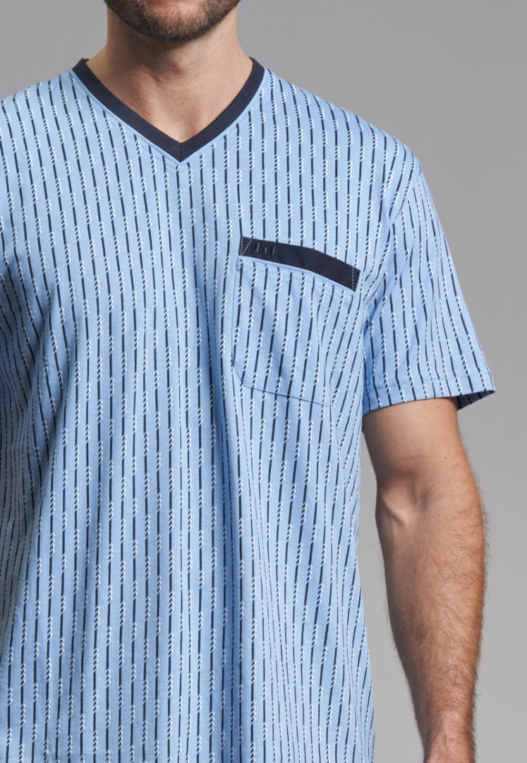 Bie diesem kurzen Pyjama mit V-Ausschnitt wurde das Oberteil in hell blau mit feinem Muster und die Hose mit offenem Beinabschluss in uni dunkel blau designt. Aus reiner bügelfreier sowie strapazierfähiger Baumwolle ist der Schlafanzug temperaturausgleichend, atmungsaktiv, hautsympathisch und erfüllt auch höchste Ansprüche an Qualität und Passform