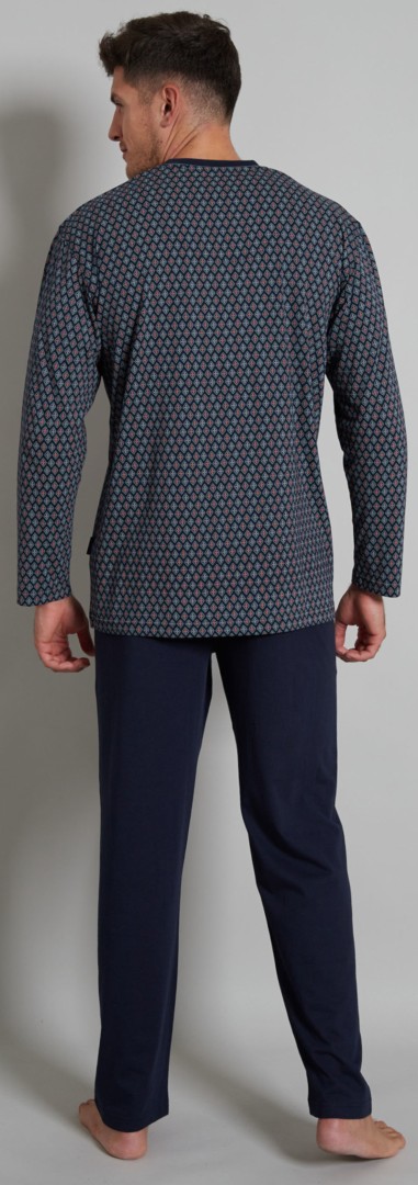 Bie diesem langen Pyjama mit V-Ausschnitt wurde das Oberteil fein gemustert sowie die Hose mit offenem Beinabschluss in uni dunkel blau designt. Aus reiner bügelfreier sowie strapazierfähiger Baumwolle ist der Schlafanzug temperaturausgleichend, atmungsaktiv, hautsympathisch und erfüllt auch höchste Ansprüche an Qualität und Passform