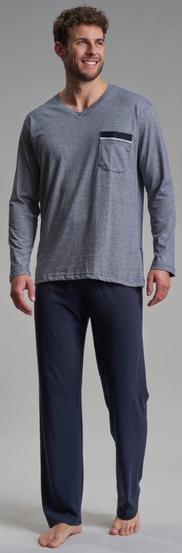 Bie diesem langen Pyjama mit V-Ausschnitt wurde das Oberteil in grau-blau meliert sowie die Hose mit offenem Beinabschluss in uni dunkel blau designt. Aus reiner bügelfreier sowie strapazierfähiger Baumwolle ist der Schlafanzug temperaturausgleichend, atmungsaktiv, hautsympathisch und erfüllt auch höchste Ansprüche an Qualität und Passform