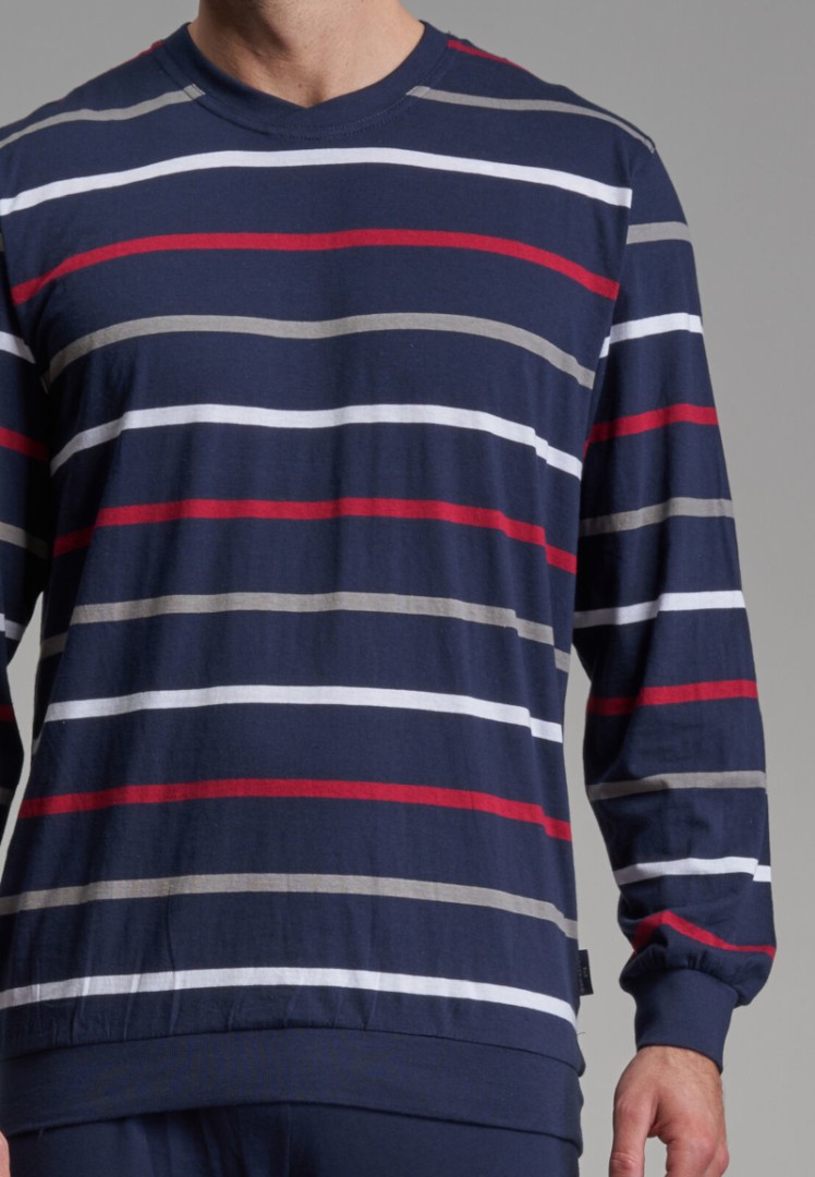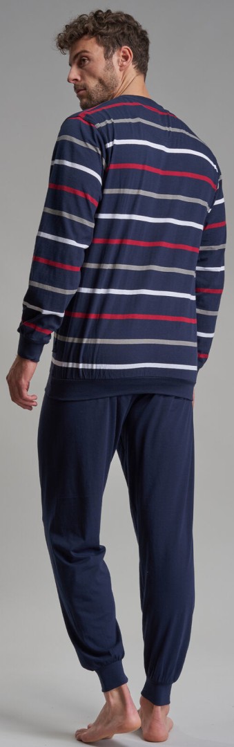 Bei diesem langen Pyjama wurde das Oberteil mehrfarbig in quergestreift mit blau und die Hose mit Bündchen in uni dunkel blau designt. Aus reiner bügelfreier sowie strapazierfähiger Baumwolle ist der Schlafanzug temperaturausgleichend, atmungsaktiv, hautsympathisch und erfüllt auch höchste Ansprüche an Qualität und Passform