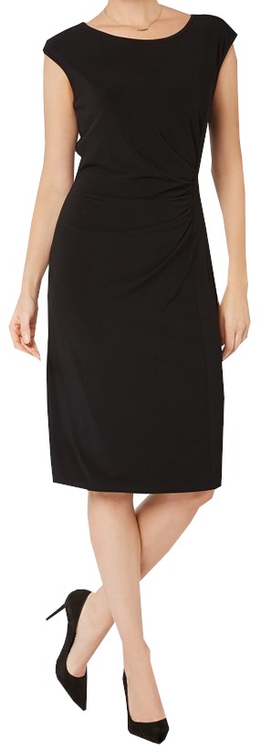 Dieses Kleid mit rundem Ausschnitt wurde in Jersey Qualität mit Wiener Naht und leicht überschnittenem Arm in uni schwarz designt. Auch durch die seitliche romantische Raffung machen Sie mit diesem Kleid immer eine gute Figur