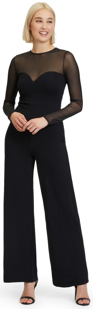 Dieser maxi lange Jersey Jumpsuit wurde in uni schwarz designt. Das Oberteil wurde hier leicht transparent mit rundem Ausschnitt und 1/1 langem Arm aus edlem Chiffon gefertigt und macht diesen Overall zum echten Hingucker