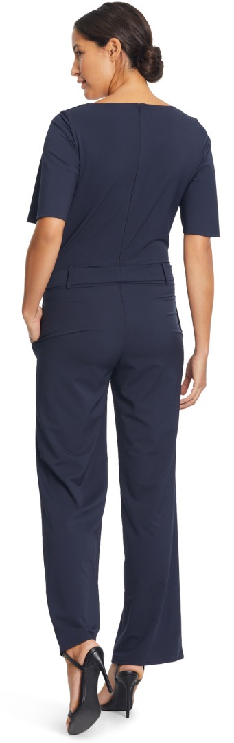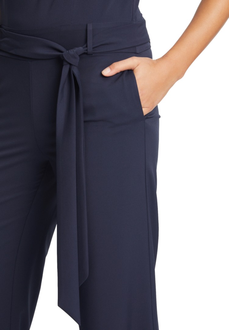 Der Jumpsuit wurde in night sky (dunkel blau) unter dem runden Ausschnitt romantisch gerafft in maxi lang designt. Die Schlaufen mit Schleifeim Bund sowie die seitlichen Taschen machen dieses Modell zum echten Allrounder auch für die besonderen Anlässe