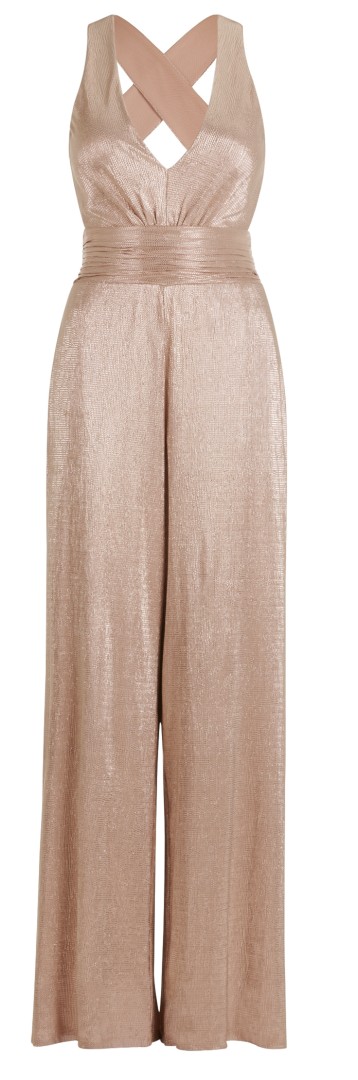 Dieser maxi lange Jumpsuit mit V-Ausschnitt wurde in pearl rose (gold) mit Glanz designt und ist ein echter Hingucker. Leicht Figurbetont mit offenem Rücken sowie breiten Trägern - seitlichen Taschen und einer Fussweiter von 66 cm - Einfach perfekt für Ihren besonderen Anlass