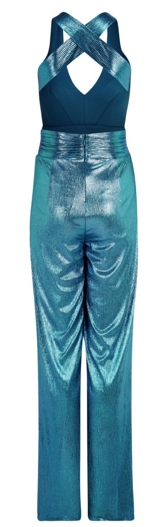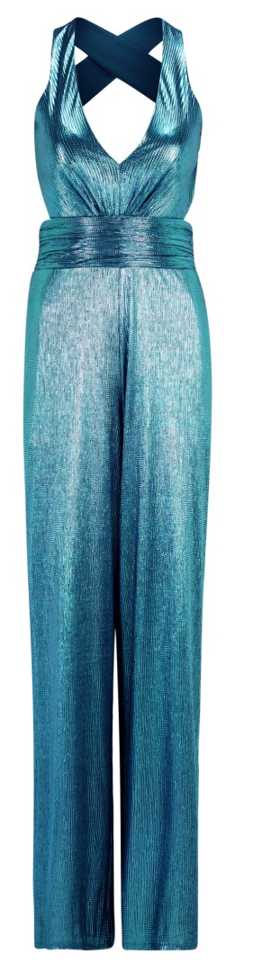 Dieser maxi lange Jumpsuit mit V-Ausschnitt wurde in smoky teal l (hell türkis ) mit Glanz designt und ist ein echter Hingucker. Leicht Figurbetont mit offenem Rücken sowie breiten Trägern - seitlichen Taschen und einer Fussweiter von 66 cm - Einfach perfekt für Ihren besonderen Anlass