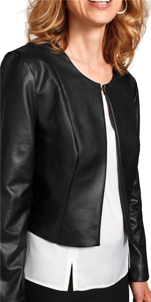 Diese sportiv kurze Jacke mit runden Ausschnitt und dem Verschluss aus Haken und Öse wurde in schwarz aus Kunstleder designt. Diese Jacke lässt sich überaus vielseitig tragen - selbst zum festlichen Anlass über Bluse oder Kleid