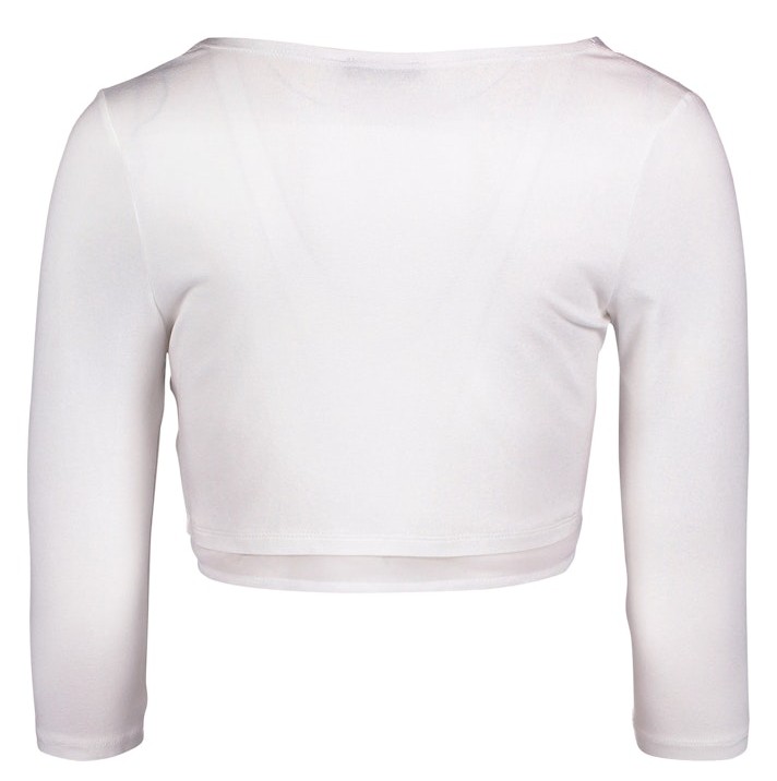 Diese fein gestrickte Jersey Bolero-Jacke wurde als kurze Variante mit dezent transparentem Chiffon Besatz in offwhite designt und ist die ideale Ergänzung ohne Verschluss zu Ihrem Outfitt
