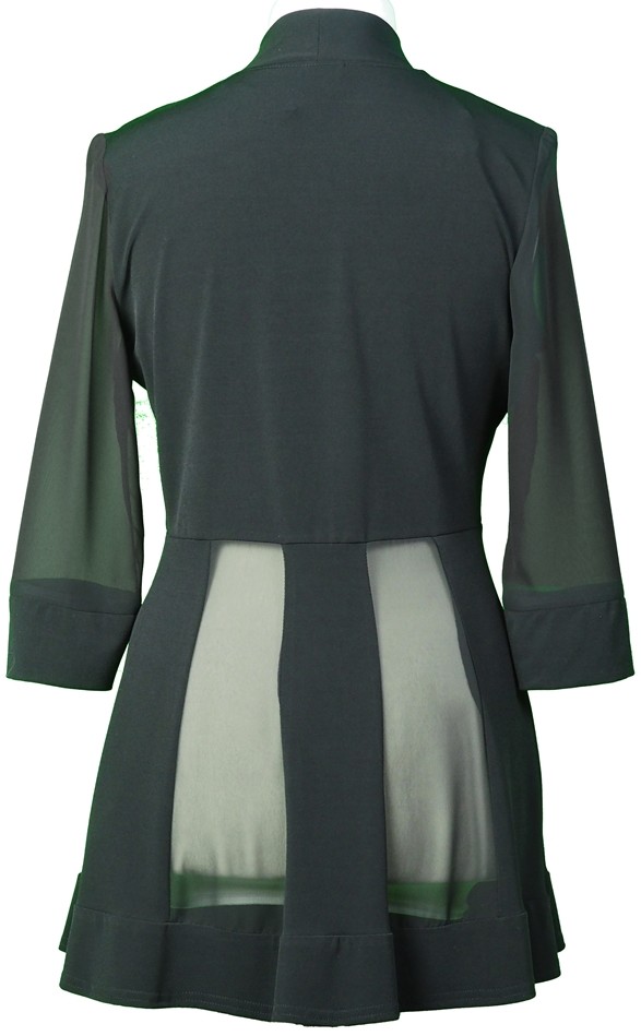 Eine top modische etwas längere sowie leichte Jacke aus feinstem Chiffon und Stretch-Jersey die auch zu den ganz besonderen Anlässen kombiniert oder getragen werden kann. Mit Stehkragen sowie 3/4 langem Arm treffen Sie mit diesem Modell in schwarz auf jeden Fall die richtige Entscheidung