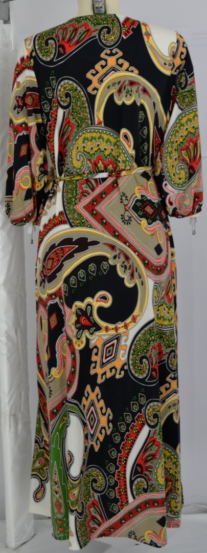 Dieses leicht fließende geschlitzte lange Bändchenkleid wurde in mehrfarbig gemustert designt. Mit V-Ausschnitt sowie dem langen Arm mit Bündchen kann das Kleid auch zu den besonderen Anlässen getragen werden