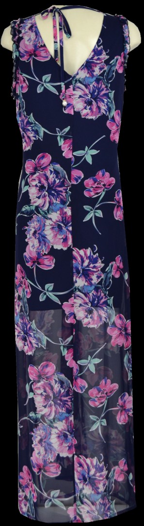 Dieses leicht fließende lange Kleid wurde in mehrfarbig marine-pink mit floralem Print designt. Die romantischen Rüschen am Arm-Ausschnitt sowie der ca. 54 cm rechtsseitige Schlitz am Rockteil vermitteln einen zusätzlichen Charme