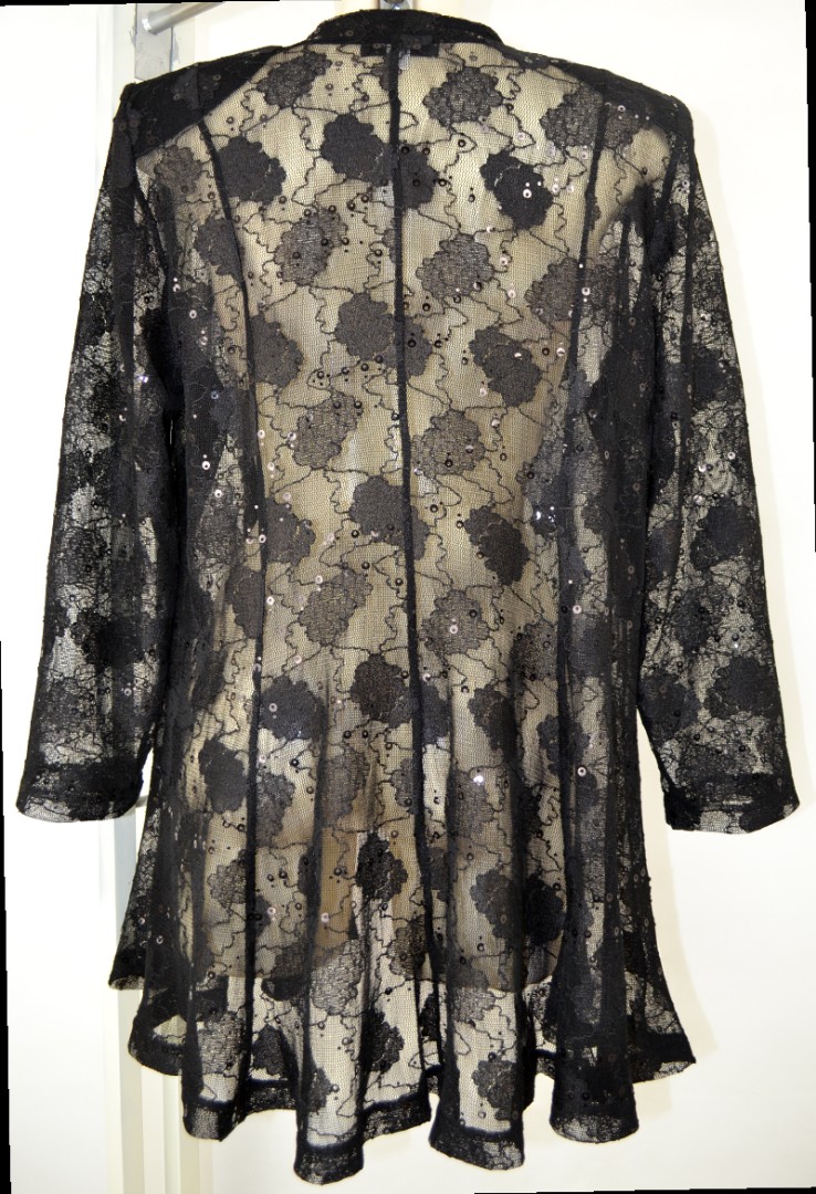 Feine Spitze und die leicht transparente Optik in schwarz mit Pailletten zeichnen diese edle Jacke aus. Ohne Knopf sowie etwas länger gefertigt kann dieses Modell sehr vielseitig auch zu den besonderen Anlässen kombiniert werden