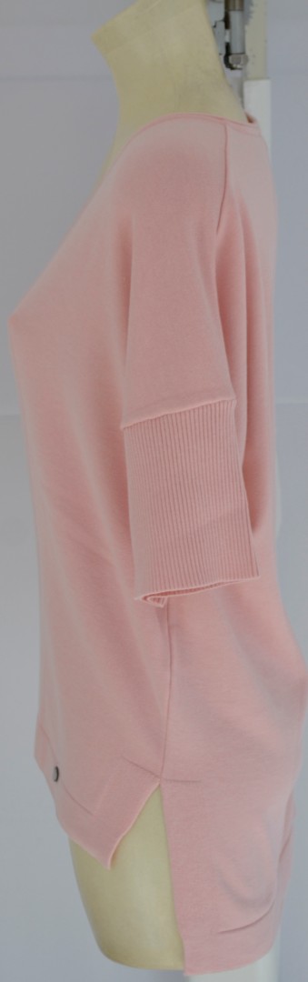 Dieser sommerlich leichte Pullover in rose wurde mit V-Ausschnitt designt. Vorne ca. 12 cm kürzer sowie mit 9 cm Schlitz im Abschluss gehört dieses Modell zu den Hightlights der Saison