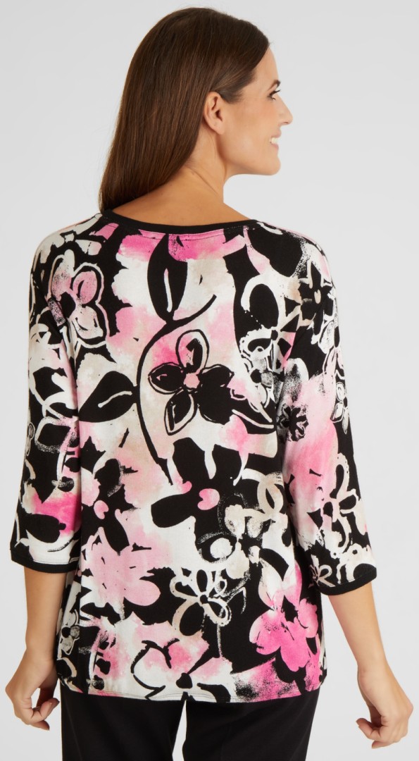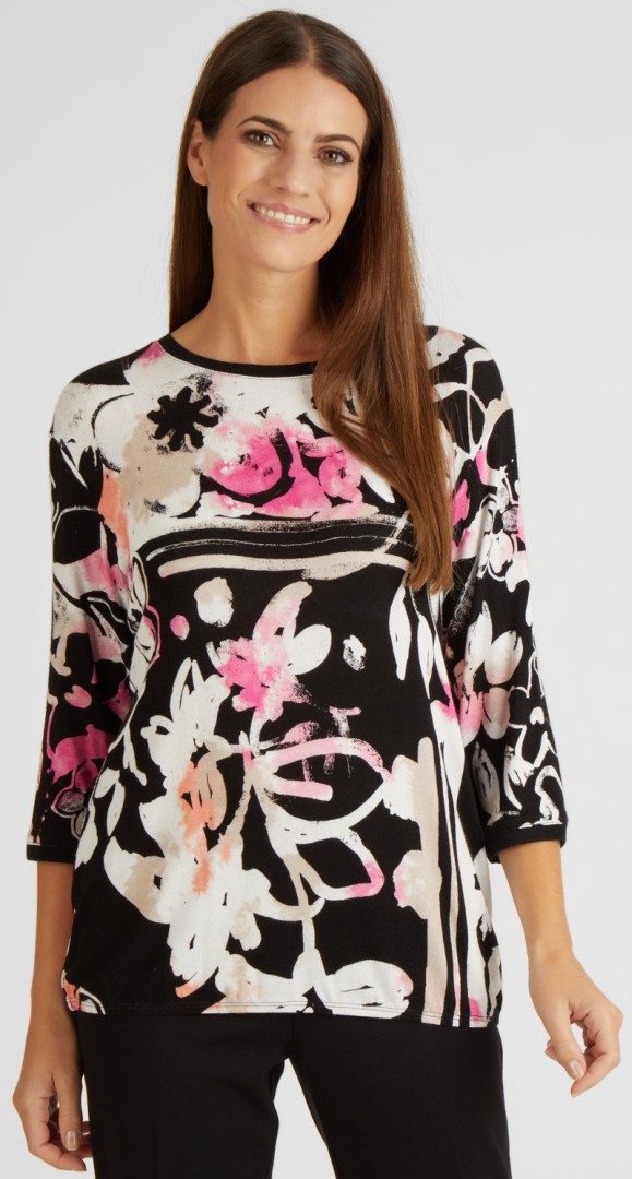 Dieser super leichte Pullover gehört in mehrfarbig floral gemustert auf schwarz mit rundem Ausschnitt und 3/4 langem Arm zu den Highlights der Saison