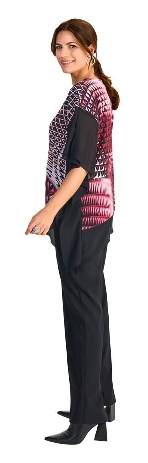 Dieses elegante Longshirt lässt sich auch zu den besonderen Anlässen prima kombinieren. In mehrfarbig gemustert mit rot-schwarz sowie mit V-Ausschnitt mit Schmuckstange ist das Modell ein echter Hingucker in diagonaler Schnittführung und Fledermaus Arm