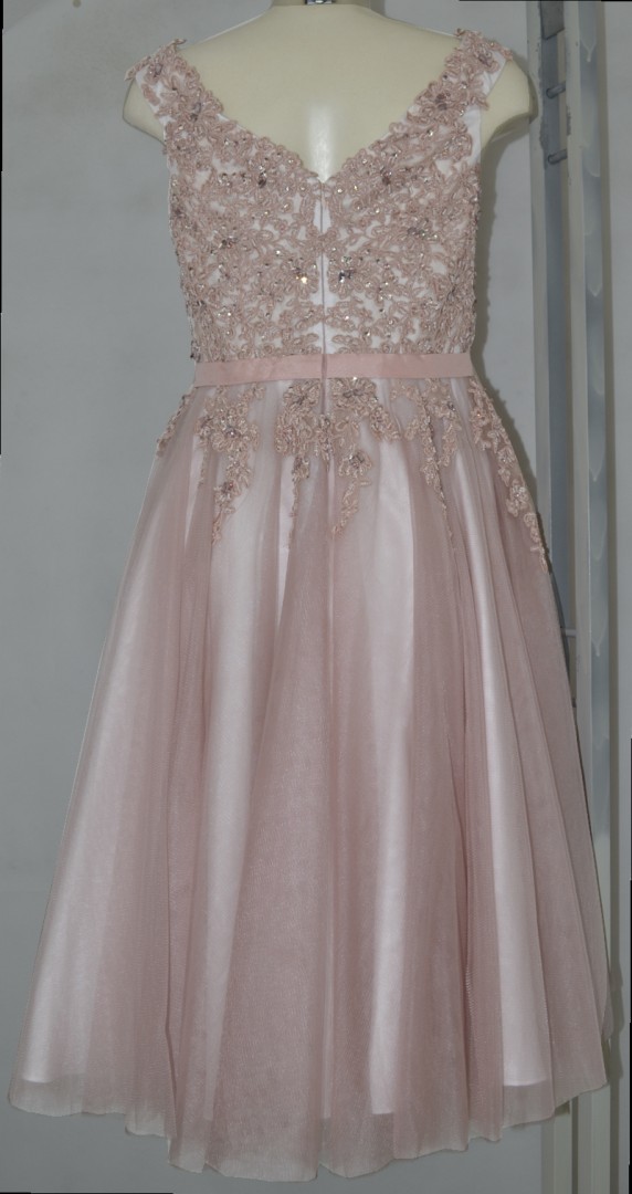 Dieses traumhaft schöne Ballkleid in leicht verkürzter midi Länge wurde in pal mauve-cream white designt. Bei diesem Modell wurde das Bustier bis in den Rockteil hinein mit edlen Pailletten und Schmuck versehen. Auch der ausschwingender Rock aus feinstem Tüll macht dieses Modell zu einem echten Hingucker unter den festlichen Kleidern