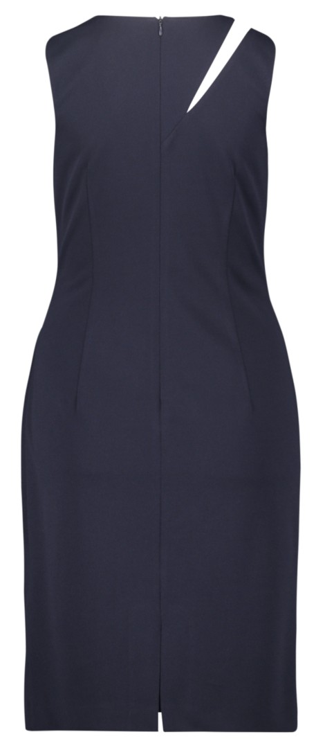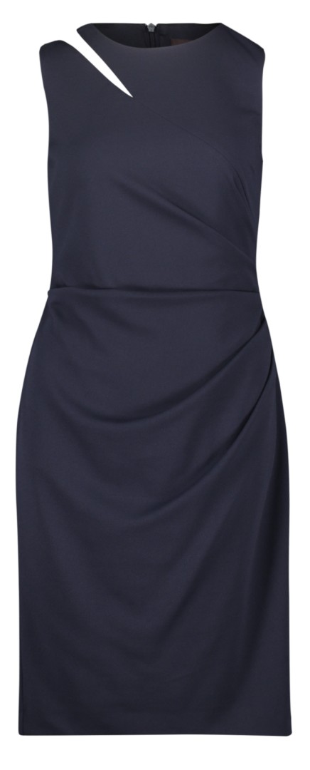 Dieses knieumspielende Etuikleid ohne Arm lässt sich sogar zu den ganz besonderen Anlässen tragen und ist ein echter Allrounder in dunkel blau sowie am runden Ausschnitt romantisch geschlitzt  und seitlich figurumspielend gerafft