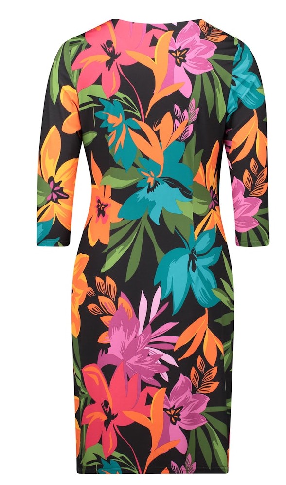 Dieses interessante Kleid in tropical (mehrfarbig floral) gemustert können Sie nicht nur zu den besonderen Anlässen tragen. In mittlerer Länge ist dieses Modell mit 3/4 langem Arm und V-Ausschnitt ein echter Hingucker. Dieses Kleid wurde zudem seitlich gerafft und macht immer eine gute Figur