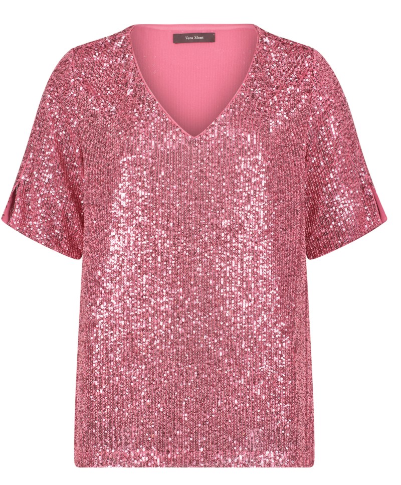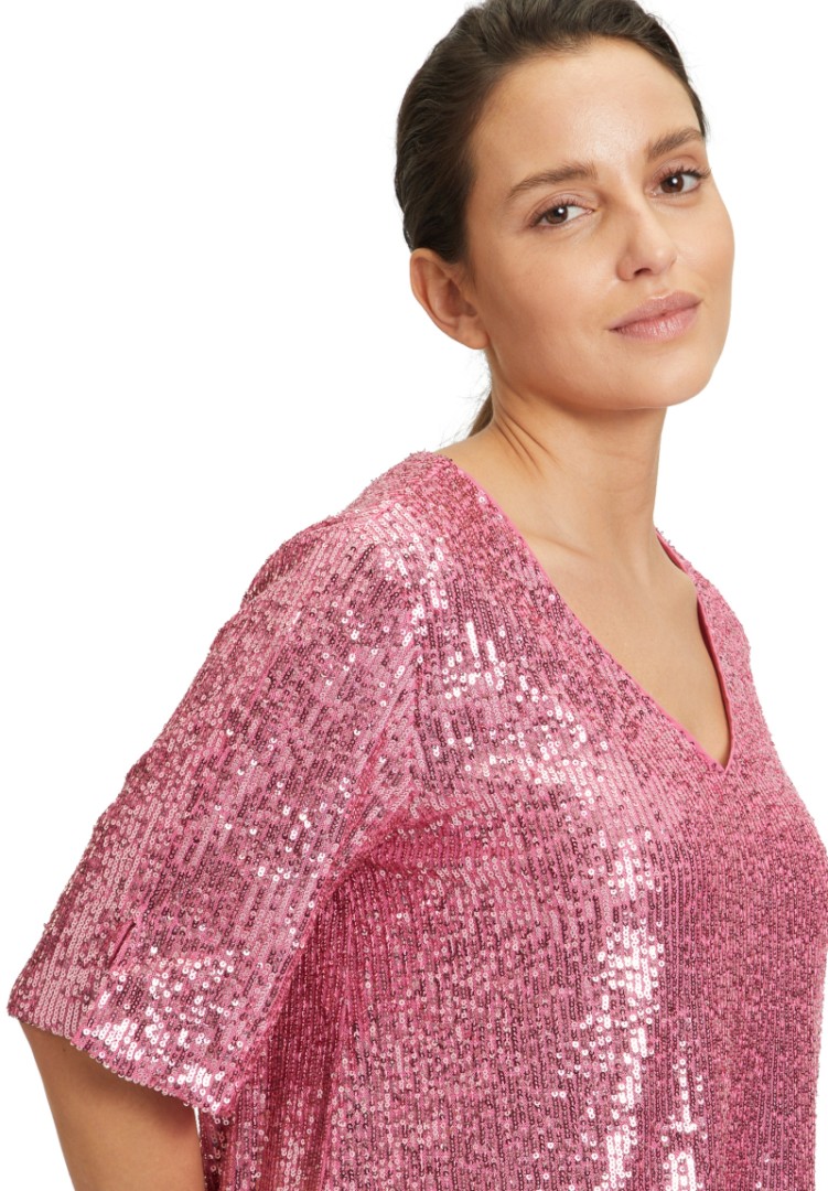 Dieses edle Shirt mit 1/2 Arm sowie V-Ausschnitt wurde allover mit Pailletten versehen und läst sich in rose-pink überaus leicht kombinieren