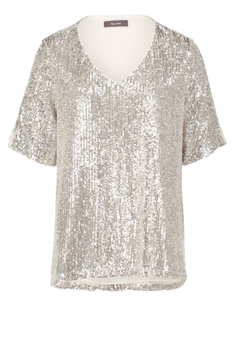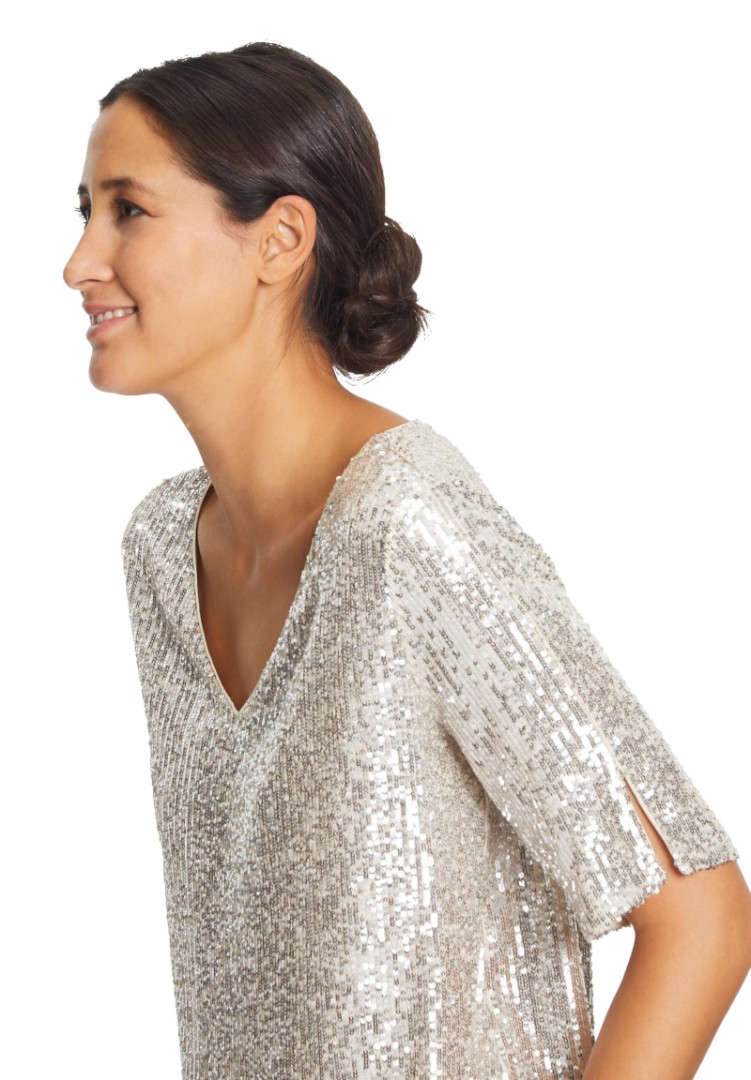 Dieses edle Shirt mit 1/2 Arm sowie V-Ausschnitt wurde allover mit Pailletten versehen und läst sich in cream-silver überaus leicht kombinieren