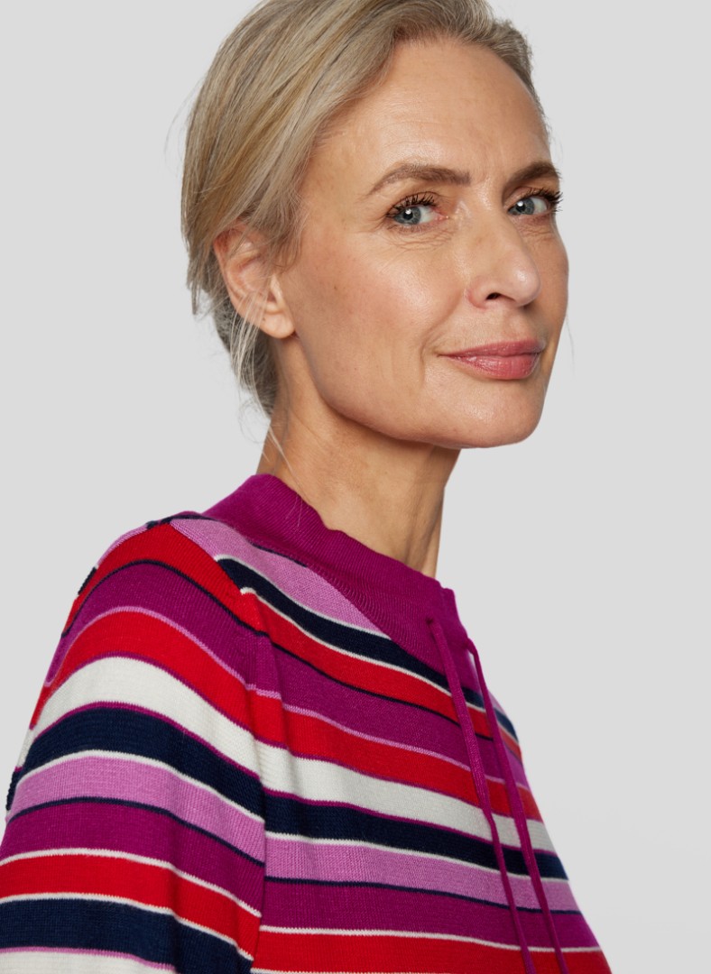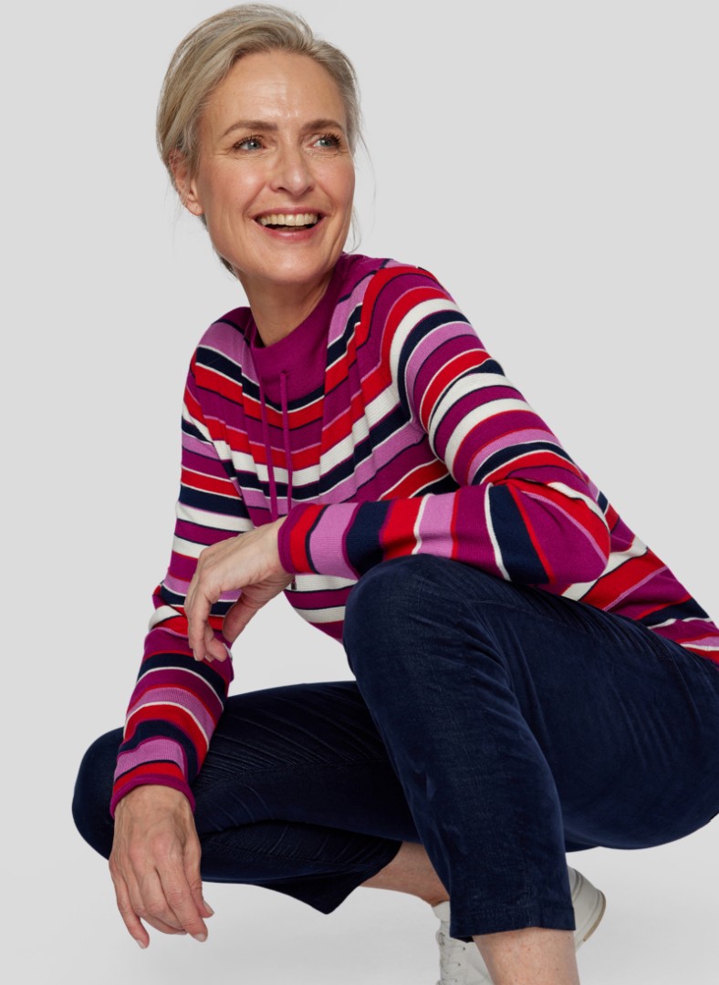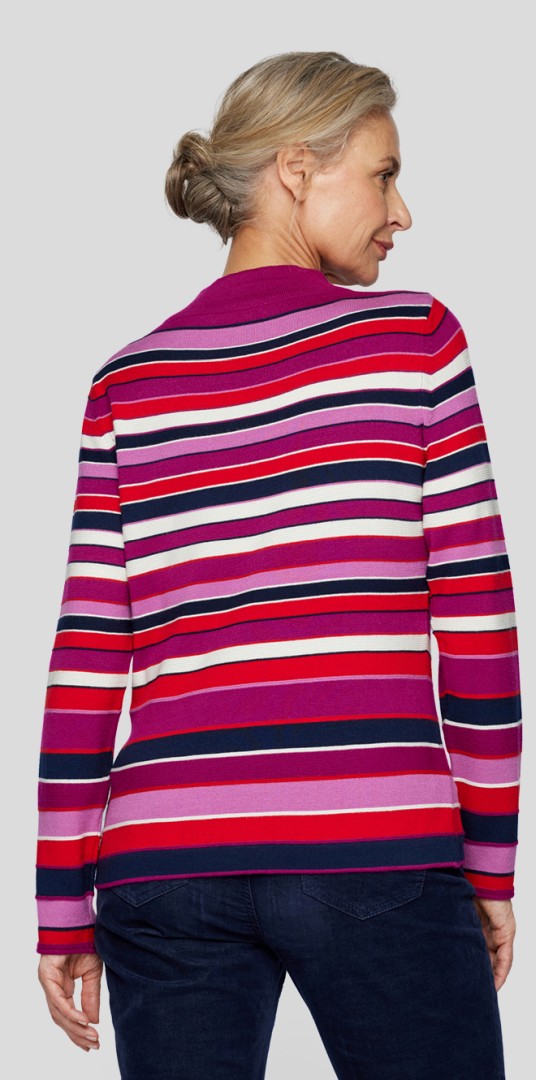Der edle Stehbund Pullover mit Bändchen wurde in mehrfarbig geringelt mit wildbeere designt und lässt sich überaus vielseitig kombinieren