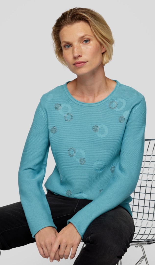 Dieser Rundhals-Pullover könnte Ihr Lieblingspulli werden. In Petrol mit prafischen Print-Minimals und dezent tailliertem Schnitt lässt sich dieses Modell immer vielseitig kombinieren und garantiert einen modisch zeitlosen Look