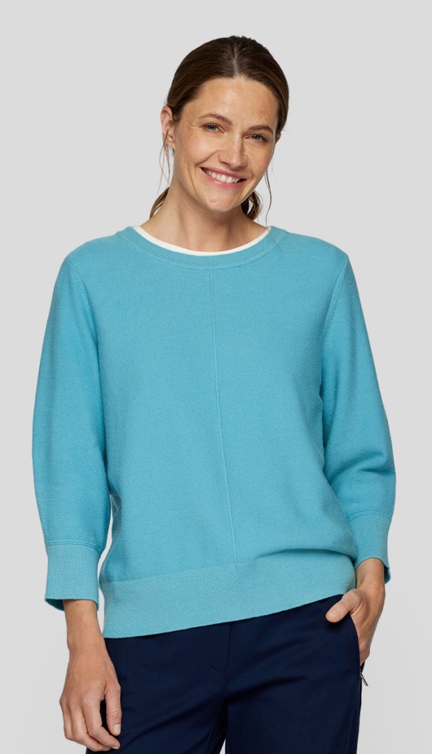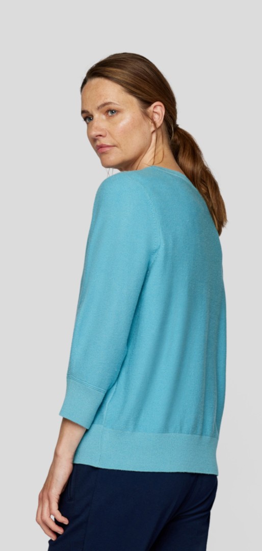 Dieser sportive und fein gestrickte Pullover mit 1/1 Arm wurde in pfauenblaubleu mit rundem Ausschnitt designt und ist immer leicht -und das ganze Jahr hindurch kombinierbar