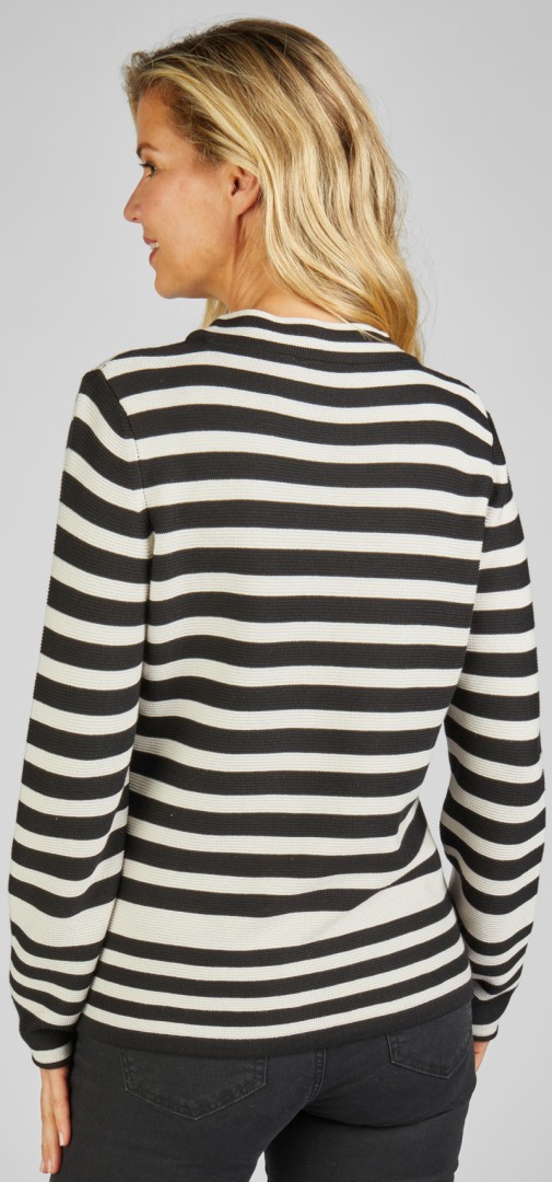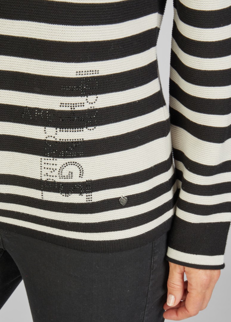 Dieser sportive Pullover mit leicht verkürztem Turtle Kragen wurde mit 1/1 langem Arm in schwarz-weiß designt und ist sehr vielseitig kombinierbar